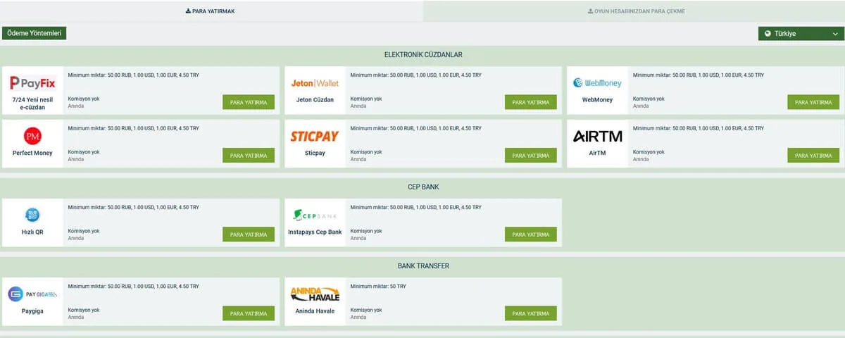 Teknolojinin gelişmesi ile birlikte para yatırma ve para çekme yöntemleri de farklılıklar göstermeye başladı. Melbet para yatırma seçenekleri arasında Cep Bank da yer alıyor. En az 10 euro olmak şartıyla en yüksek 10 bin euroya kadar paralarınızı mobil bankacılık işlemlerini kullanarak transfer edebiliyorsunuz. Garanti Bankası, Yapı Kredi, İş Bankası ve diğer bankalar ile işlemlerinizi yine komisyon kesintisi olmadan yapabilir ve anında paralarınızı bakiyelerinizde görebilirsiniz.
